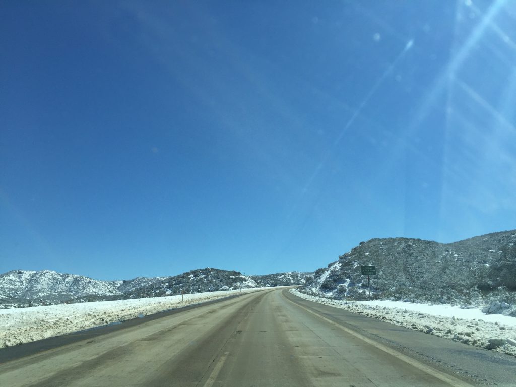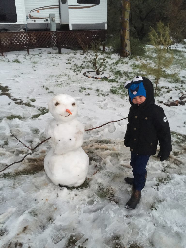 The snow was still there in the morning, much to his surprise. The roads were closed as the county scrambled to find plows or shovels to get rid of this foreign substance. We read a report that they had one plow, but it broke down. Nobody wanted to drive in these conditions, and a lot of the locals didn’t know how, so they and their neighbors decided to keep the kids home. He spent his first snow day ever playing with his friends, knocking over the snowman and trying to sled on the hill across the street. The sun was quickly melting what was left, so the kids made hay while the sun was shining and had a great time. Once the interstate was open, I packed up my things and hit the road toward Arizona, eager to see my parents.
