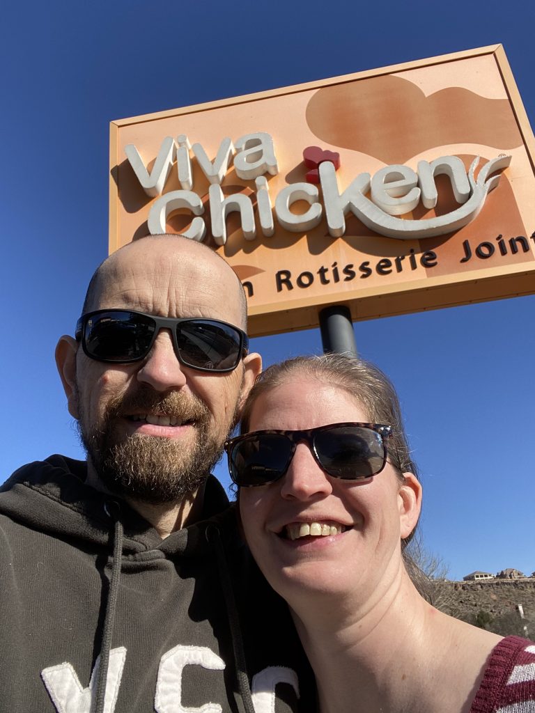 After getting a little work done on Saturday morning, we headed out to CB Maddox, which serves the best friend chicken that I have ever tasted. I ate there a lot when I lived in Utah, and was disappointed last year when I passed through on a Sunday, only to find them closed. I wasn’t going to fall prey to bad planning again this trip, and started planning our time in Utah before we left Tucson to make sure that we would be here on a day that they were open. They don’t have a dining room or any indoor space, so we parked and walked up to the outside window (there’s also a drive-thru option, but the walk-up is the way to go). We each ordered our meals, then answered questions while we waited for them to prepare them. “What’s a cornpone?” Zibby would ask. “You’re going to get one,” I answered. “What’s fry sauce?” she would inquire, to which I would answer, “Delicious. You’re going to like it.” The wind was blowing, making us feel colder than it really was, so we opted to eat in the car instead of at the picnic tables. “What’s this stuff?” Zibby asked about a small ramekin of a golden sauce. “That’s honey butter for your roll and cornpone,” I explained. My heart sang as I shared a meal from my favorite fried chicken joint with the woman that I love. After we both over-ate a little, we headed north to Ogden, where some of our friends were training at iFly, the skydiving simulator in Ogden. It’s a joy to have a front row seat watching teams train, skydiving right in front of our eyes. We chatted with a few of our friends between training rounds, then headed back to the hotel – they had been there training since dawn and would still be training until nine o’clock that night. We chatted about what we wanted to do on Sunday, then turned in a little early.
