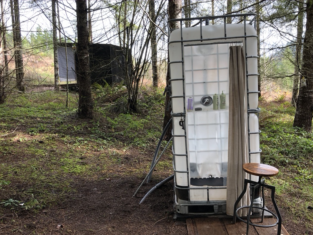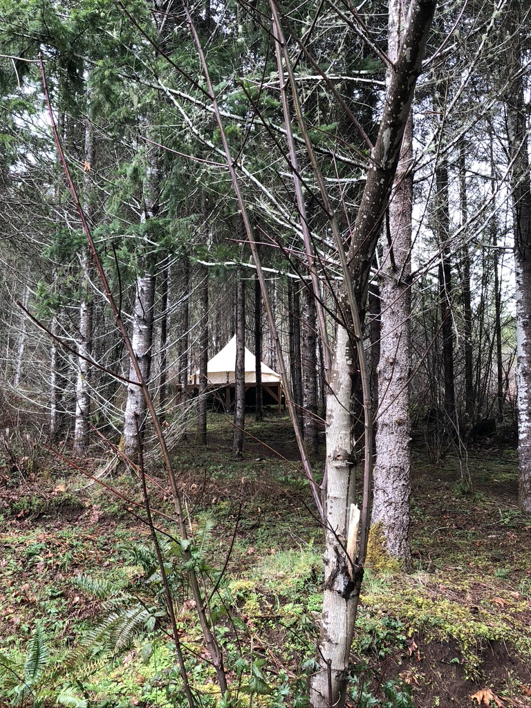 This area is very wet this time of year. They say “If you’re ever planning to move to the Pacific Northwest, just stand in a shower for 10 months – if you’re okay with that, you’ll love it here.” The air has been generally wet, with a mist of light drizzle every now and then while we’ve been here. The tree tops protected us from the lighter drizzle, but it wasn’t always that light. We woke up the third morning to the sound of rain drops on the tent. It’s very peaceful to lie in bed, warm under the blankets, looking up at walls glowing with the day’s light and listening to pitter-pattering raindrops all around. We lie like that for a while until we realized we both had to get up and use the bathroom, so we reluctantly got dressed and as waterproof as we could manage, then set a plan to efficiently get the generator started, both use the restroom, and regroup in the kitchen for breakfast. Luckily, Orion was up to help Zibby with the generator, and the kitchen was comfortable by the time I got there. With the rain, the four of us spent most of that day just sitting around the table, chatting and working on computers. Orion and Robin would take turns venturing out to check off a random chore. I helped him mount some lights and made some room for him in the car, but mostly the day went by without much to report. Sunday, Zibby and I packed the car and mostly stayed out of the way while they wrapped up some chores before he would be leaving for five days. He started a new job on Monday, and wanted to make sure she would be comfortable and prepared while he was gone. The wood was chopped and stacked, kindling separated from longer burning pieces, propane got refilled, heaters moved around, and other odds and ends of homesteading. He had to pick up the company car near Portland, so we packed him and his gear into the car and dropped him off at the office on our way, stopping at Sweet Life, a patisserie in Eugene, to grab some sweets for the next step in our journey. After dropping him off to meet a friendly and cheerful coworker who talked him through the car and tools, we said our goodbyes and drove another hour to our hotel. We thought about going out and seeing the town or meeting friends, but once we stepped into the room, it was clear that we were going to shower, grab dinner, and head to sleep. We were both dirty and exhausted, happy from the experience, but ready to wash off and pass out.
