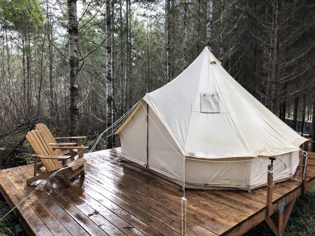 After a delicious chicken and mushroom dinner that Robin whipped up and some games and laughter, our eyelids got heavy and we decided to get some sleep. We grabbed a flashlight and walked up the hill to our tent, Leroy walking beside us to make sure we got there alright. Safely inside with the flaps zipped, we heard Leroy head home to their cabin while we arranged our belongings, turned the heater to low, and climbed into bed.