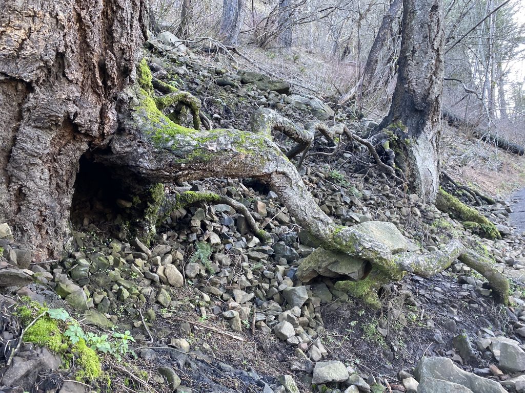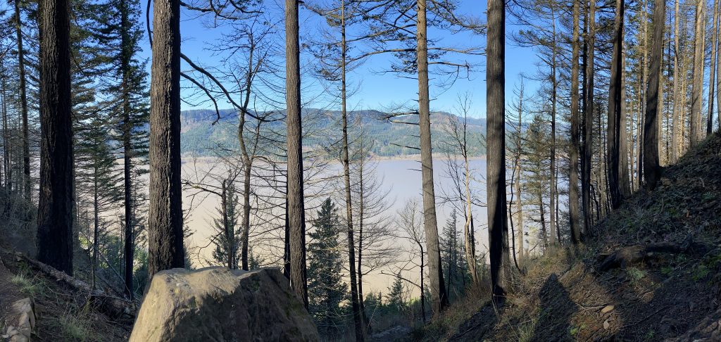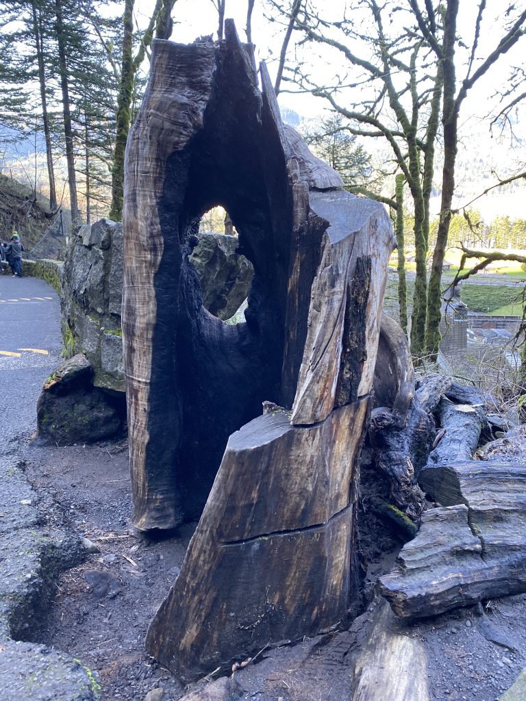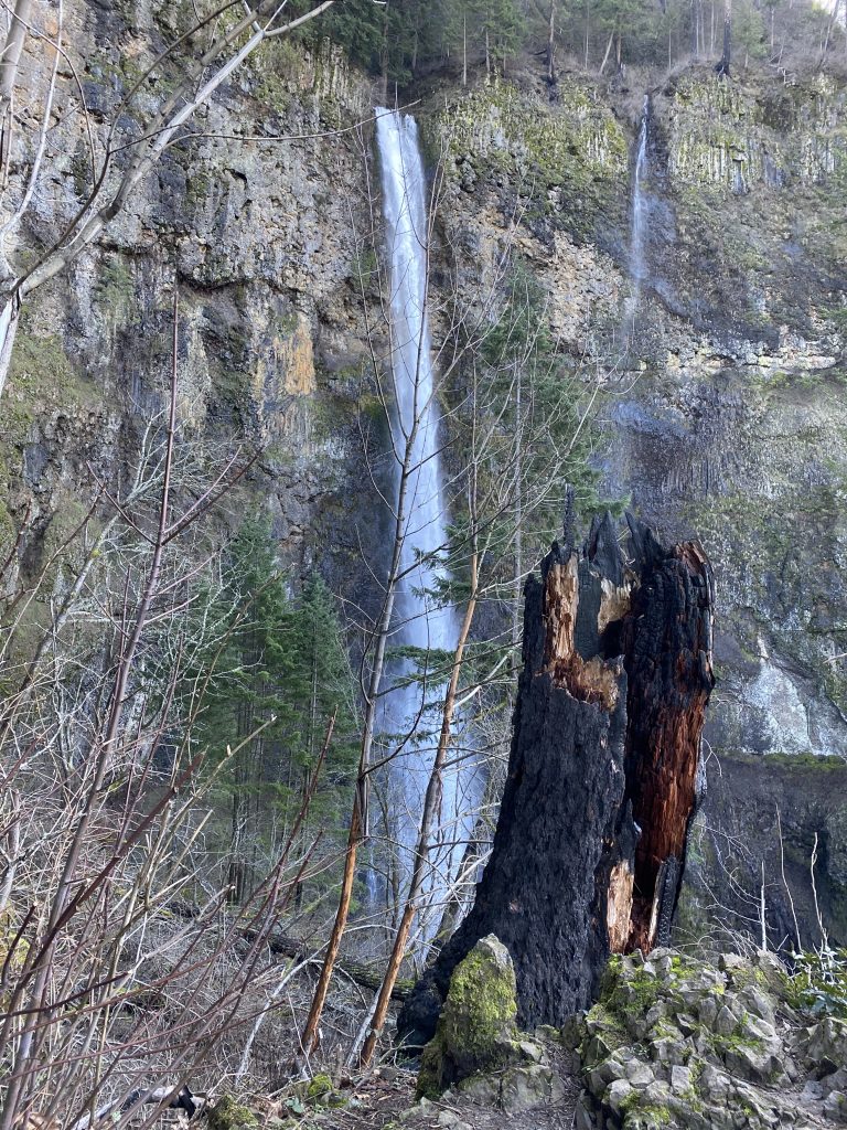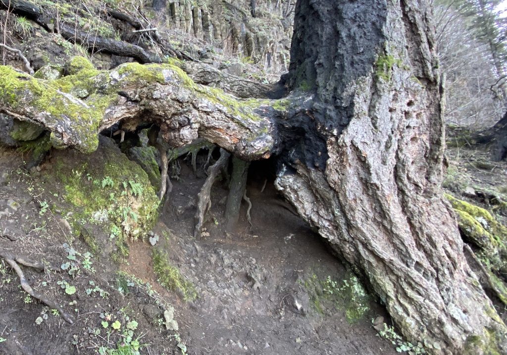 After a few photos, we followed the path further until we were the ones standing on that bridge, the mist heavier now that the path had brought us closer to the waterfall. As much as I hate getting wet, I hustled through there quickly and wound up the path on the other side, wondering if this path might lead us to the very top. After another switchback, the signs indicated that we could reach the observation deck at the top of the falls in only another mile! Excited and energized, I continued up the path with Zibby in my wake, stopping every now and then to wait for her to catch up. With her longer legs, she’s usually the one that has to wait for me, but while her legs of a gazelle perform magnificently on the flat paths and roads of the midwest, my little goat legs were better suited for the incline and uneven footing of the paved mountain path worn away by weather, fires, and age. In 2017, a fire tore through the land surrounding us, which decimated the forest and man-made paths. As we climbed, stout old growth trees with singed trunks would give way to saplings and brush pushing their way past charred logs and stumps, then back again as if the fire was strong enough in some areas, but couldn’t overpower nature just a hundred feet away.