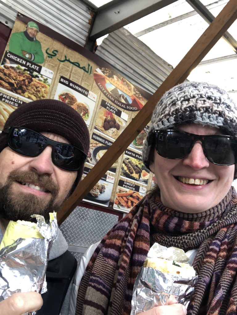 We had a great time in Portland, and discovered even more reasons to come back and explore more of the town next time. Monday morning, we slept in a little, then went down to the lobby for breakfast at the Econo Lodge. Some hotels have quite the spread for breakfast while others will provide the bare minimum so they can advertise “breakfast included” in their listings. This was one of the latter, with muffins cut in quarters and a coffee pot. Zibby was able to fill her travel mug and we went back to the room for leftovers we had in the mini fridge. We spent the morning cleaning up and getting some work done, then decided to head downtown for a little people watching. I didn’t think about it being President’s Day, and what that would mean for the crowds, but we were able to find parking relatively easily. As a bonus, parking was free since it was a national holiday. We headed first toward Voodoo Doughnuts, a famous doughnut shop that serves doughnuts with names like “old dirty bastard”, with oreos and peanut butter or “Grape Ape”, with vanilla frosting and grape kool-aid sprinkled on top. As we approached, the line was out the door and up the block – there’s always a line there, and it’s not because customers have much time to order – so we decided that we didn’t need the sugar rush, and kept going. Still hungry, though, we stopped at one of the food truck parks that are sprinkled around Portland. After a few minutes checking them all out, we decided on an Egyptian Halal truck that promised he had the best chicken in town or our money back. We placed our order, then sat to the side and watched the people go by.