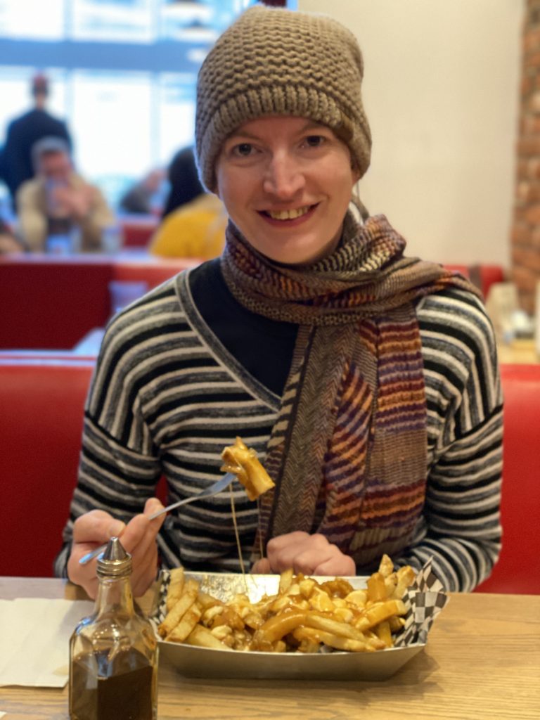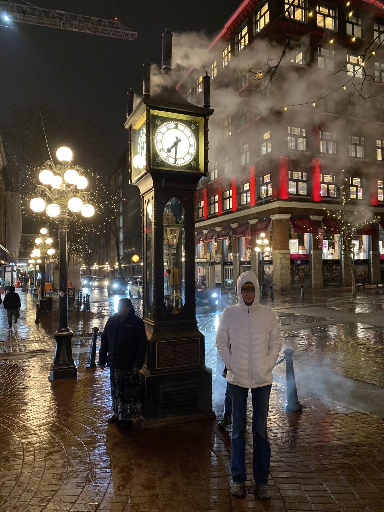 While she took pictures and marveled at the marbling of the twists and knots, I joyfully told her that I had sent her a picture of that exact piece last year. It warmed my heart for her to be able to see, in person, something that had reminded me of her when I first saw it. We walked the path for about an hour, seeing ducks and ships and Candians along the way before we returned, exhausted, to the car ready to find a hotel. A short drive later across the Lions Gate Bridge (which was built by the Guiness family in 1938 to gain access to their land on the north shore of Burrard Inlet, and later sold to the province) we were checking into an Econo Lodge not far from the shops and restaurants. We cleaned up and unpacked, then headed out to Yummy Donair and Kebab, a local healthy fast food restaurant serving kebabs and Mediterranean food. Tuesday was forecast to be colder and rainy, so Zibby got some work done while I went shopping at Canadian Tire, a chain store that sells all kinds of auto, hardware, tools, paint, sports, and outdoor products. I didn’t see any tires, but they assured me they sell some of those too. We headed down to Gastown, a district just outside of the downtown Vancouver, to walk the cobblestone roads, gaze in the unique shops, and eat dinner.
