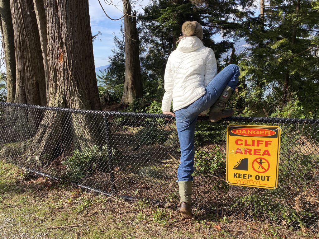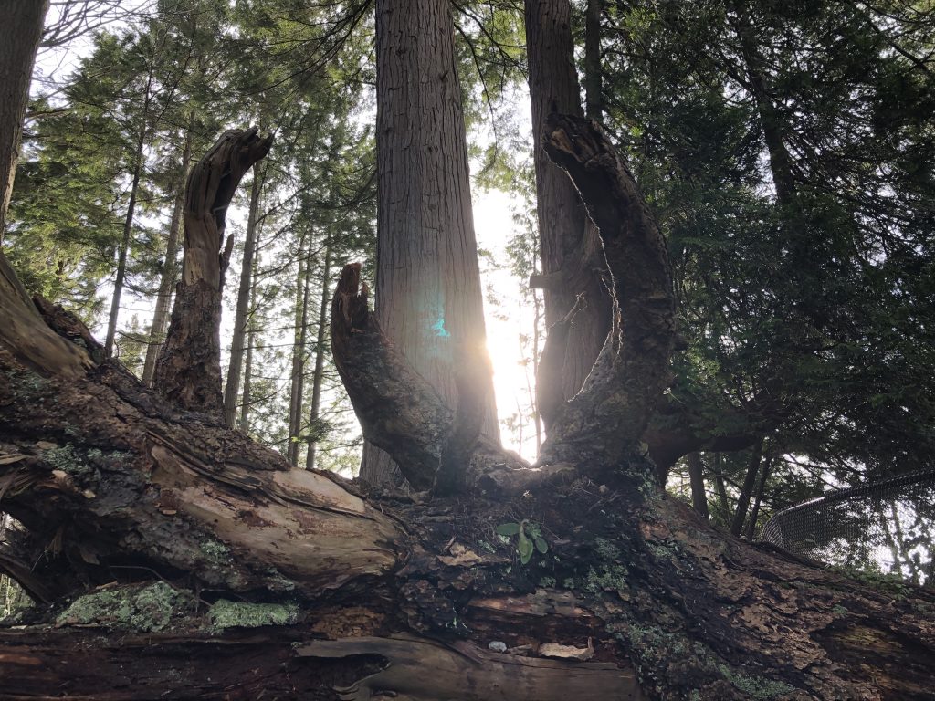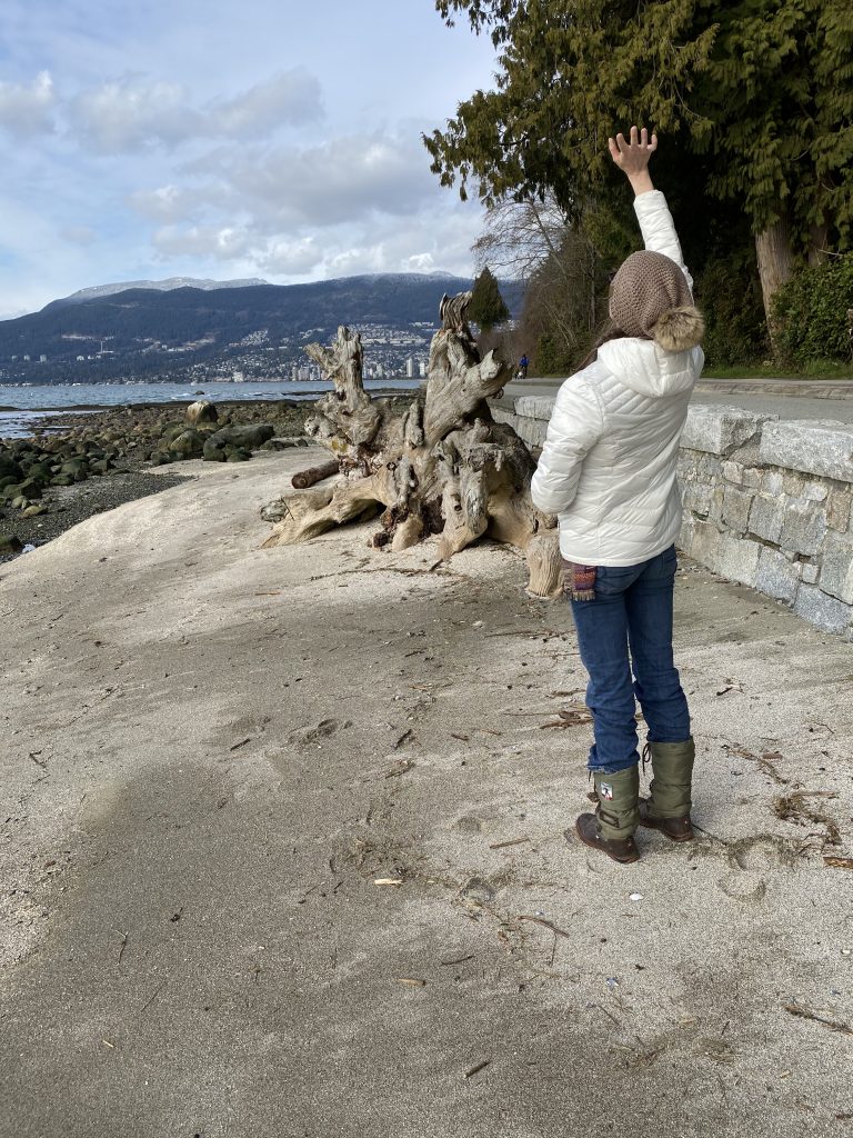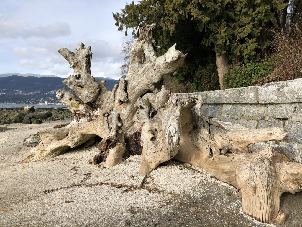 Our first stop was Stanley Park, a large rounded peninsula that has been kept mostly as a nature preserve as the iron and concrete jungle of a city sprouted up around it. Native inhabitants hunted and lived in the area for centuries, with stories passed down shaping their history, the British built fortifications and gun turrets over the years to defend their port, and finally the armaments were stripped and the citizens demanded that it become a park, available to everyone. The city built a seawall with paths along the entire coast of the park and stretching beyond into the city itself, and has a number of lookout decks and patios where visitors can see the city across the bay and the enormous ships waiting their turn to offload or take on cargo in port. We parked near Prospect Point and, after getting a few pictures of the Lions Gate Bridge, started down one of the many paths through the park, hoping to walk along the famous seawall. Having misread the map, we had a fun hike up and down some steep paths, took in some gorgeous views, and took in some history from the plaques positioned along the trails. After a couple miles, the equivalence to 21 flights of stairs up and down, and the realization that I was looking at the map wrong (a dotted line indicative of a trail did not, in fact, quite connect the trail we were on to the seawall – it was a lookout over the bay with the seawall and path right below us), we found our way back to the gift store and coffee shop where we started. A short drive later, we parked the car closer in elevation to the waterfront, and took some stairs down to the seawall path. The planners were very smart when they laid out the park. There are two lanes on the path – one for pedestrians and the other for bikes and roller blades – and the bike lane is one way so riders don’t collide as they come around a bend. There are also benches along the pedestrian path with plaques, many of which were donated by family after a loved one, who had spent their lives enjoying the park, had passed away. It was touching to read the brief story on each plaque and imagine the person who inspired it. The wall has stairs down to the occasional beach of washed up sand, rocks, and drift wood where we saw people walking their dogs, sketching in an artist’s pad, or reading. At one of these beaches, Zibby saw a twisted and weather-worn piece of driftwood, probably a tree stump, lying on its side as far around as we were tall.