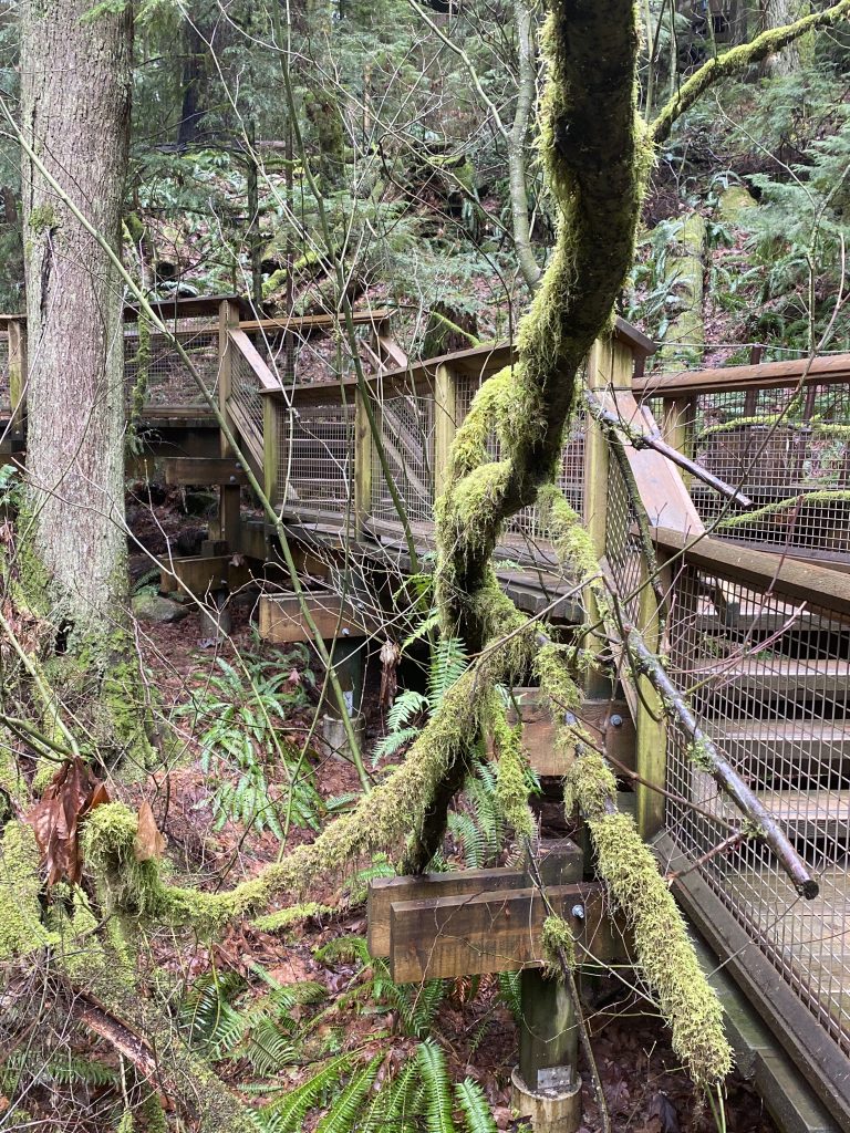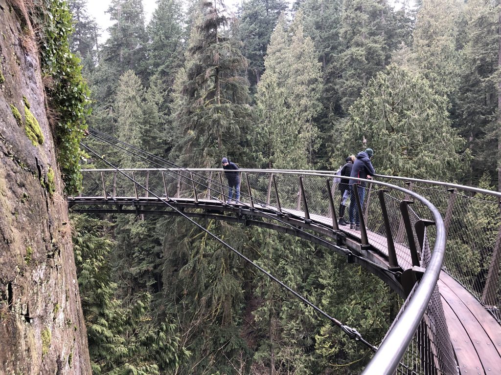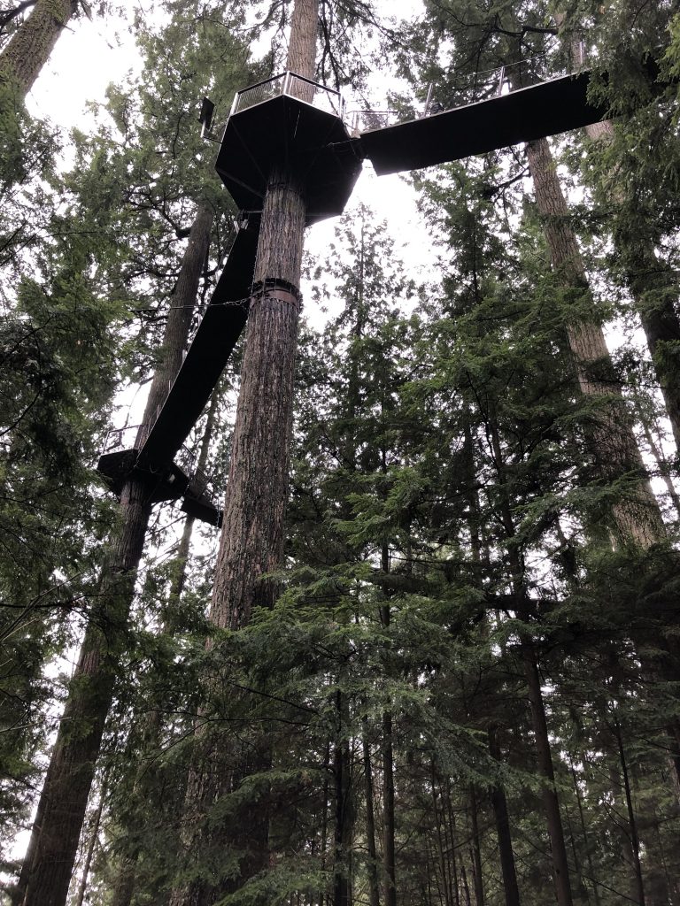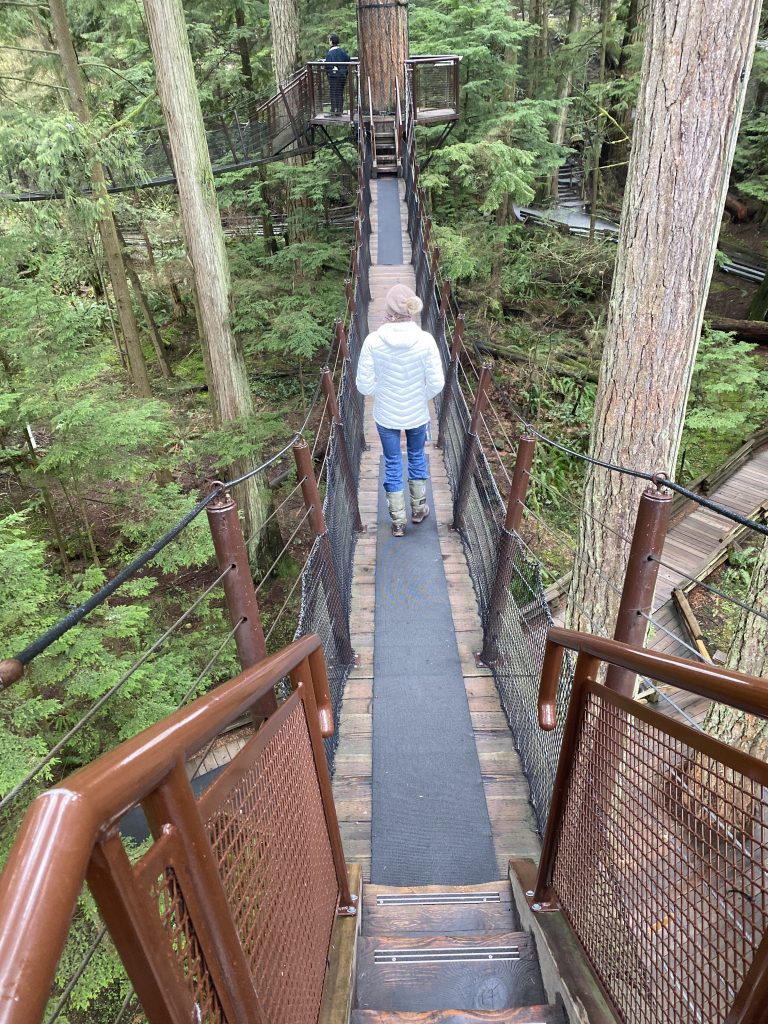 I think I’ve mentioned this before, but Zibby LOVES bridges. We look for them whenever we road trip together, and even took a day trip for her birthday last year to drive across the Chesapeake Bay Bridge-Tunnel when we were in Virginia. I surprised her on Wednesday with a trip to the Capilano Suspension Bridge Park, just up the road from our hotel. The namesake feature is a pedestrian suspension bridge, 450 feet long and 230 feet above the Capilano river. The view is gorgeous looking down at the river rushing below as the bridge sways to and fro. The joyful smile on Zibby’s face, though, was even more rewarding. The bridge is suspended by thick steel cables, anchored by concrete piers on either side. In 2006, one of the massive trees toppled over from a perfect storm of rainfall that softened the ground followed by wet heavy snow that weighed down the branches. The tree landed on the bridge and move the anchors two meters, but the steel cables held and the bridge survived! They carefully removed the tree, then sank even larger anchors and reinforced the bridge further. Knowing all that, we felt entirely safe walking across this bridge capable of holding several 747 airliners.