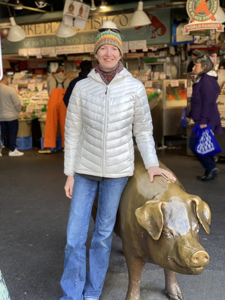 Thursday morning, Zibby got a little computer work done while I fixed a switch in the kitchen, then we headed downtown to see Pike Place Market, Seattle’s permanent farmer’s market, established in 1907. Traffic was light and we found parking right away, then headed into the market. As we walked through the door of the crafts vendor area, Zibby stopped to look at a scarf at the very first stall that we came to. As she reached for a knit scarf draped around a hangar, a crotchety old man in the next stall over yelled at her “DON’T PULL ON THE SCARVES! IF YOU HAVE TO TOUCH IT, USE THE BACK OF YOUR HAND! THERE’S A SIGN RIGHT THERE!” as he pointed at a small sign on the table. We both recoiled at the sound of his voice and walked 180 degrees in the opposite direction to look at other vendors’ wares. Stunned by her first impression of this world famous market, I was worried that she would form a negative opinion of the whole experience. Luckily, we came shortly thereafter to MJ Yarns, where we met a warm and inviting gentleman selling skeins of hand-dyed yarn with whom she was able to geek out about spinning and dying yarn, discuss uses of the different weights of yarn, and commiserate about the crotchety old man she first encountered. He did as much or more to give her a good, friendly opinion of the market as the cantankerous geezer had done to scare her away, and single-handedly made her memory a positive one. After chatting with him for a while, we wandered past other stalls, seeing all sorts of unique artwork, functional gifts, and homemade foods and desserts. She really wanted to see the fish being thrown, so she staked out a spot near the corner of their booth to wait for the show while I looped back to some other stalls to get some dried fruit and jellies to take home. One of the fish throwers asked if he could help her, to which she replied “oh, I just want to see fish get thrown.” He let her know that they throw the fish when someone makes a purchase, but she let him know that she doesn’t like fish and wouldn’t be buying any. “You’re saying all the right things, lady!” he answered, and they both laughed. Eventually, they threw some fish back and forth just to give her a show while announcing to everyone that if they wanted to see a bigger show, someone should buy something. She recounted this story to me when I returned, then decided to buy some hot sauce from them for entertaining her.