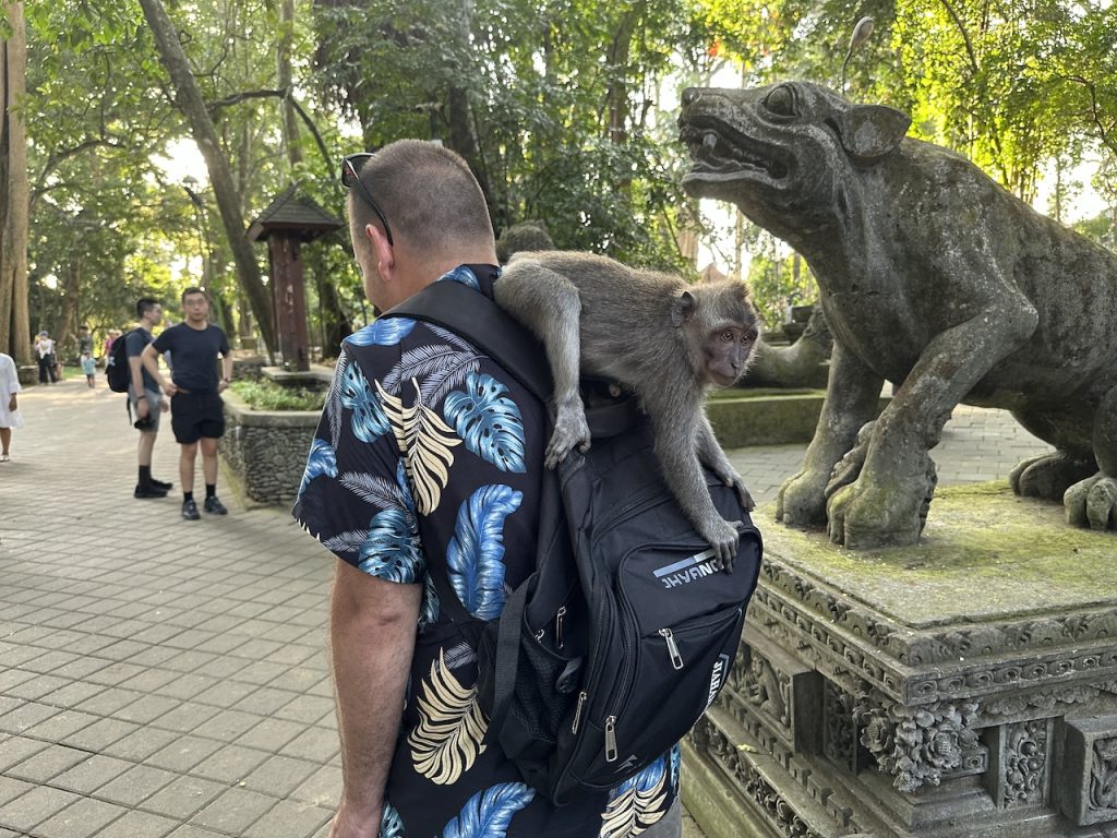 A few people left after they discovered that the monkeys were too much, but a few of us stuck around and got some fun photos. As my group was nearing the entrance, a monkey jumped on David’s back to investigate his backpack and see if he had any tasty treats.