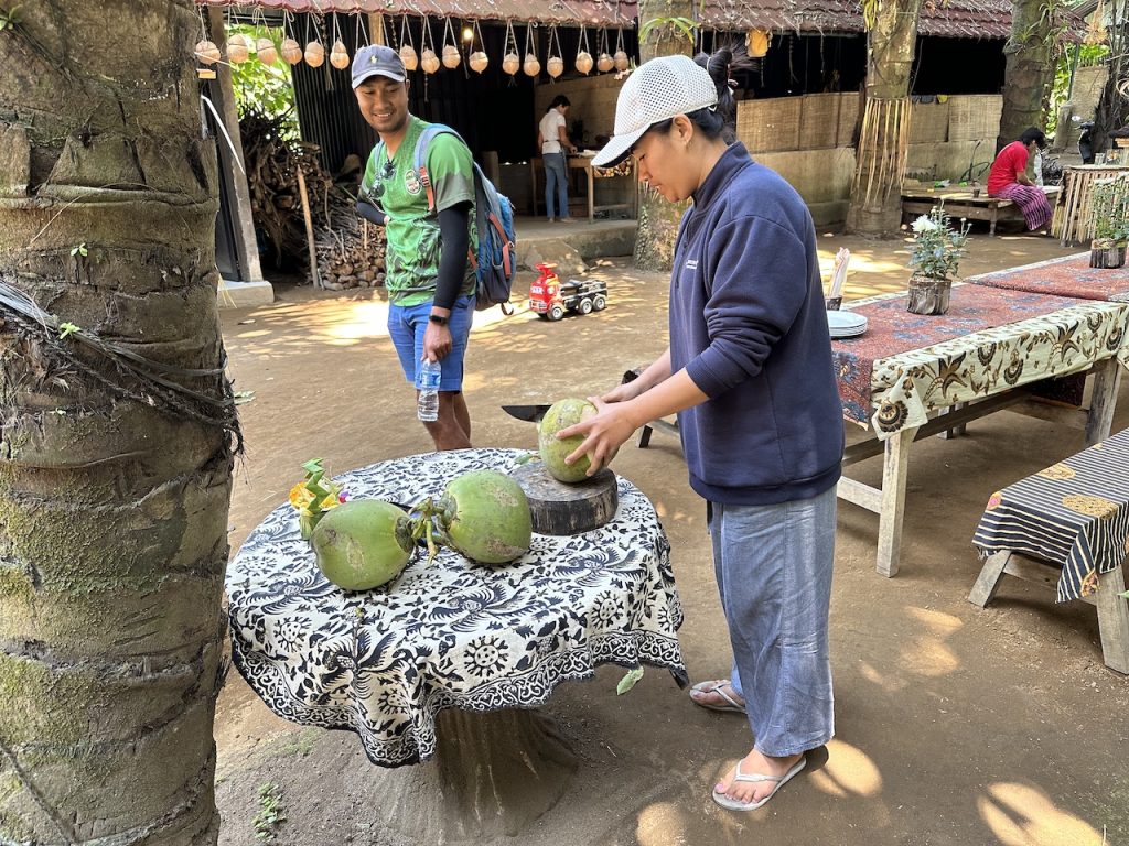 We saw terraced rice paddies, villages, and jungle as we rode along, stopping at a temple for a history lesson in one town, and a pavilion in the middle of nowhere for fresh coconuts and a snack. It was exciting watching the host hack away at the coconuts, drill a hole, and hand it to us with a straw. Refreshed with our snacks, we thanked our hosts and continued on through some narrow forest paths, wound through a rice field, and emerged mostly unscathed – Rachel did find a muddy rice field to sink into, but she treated it all with good humor and gave us all one more memory for the trip.