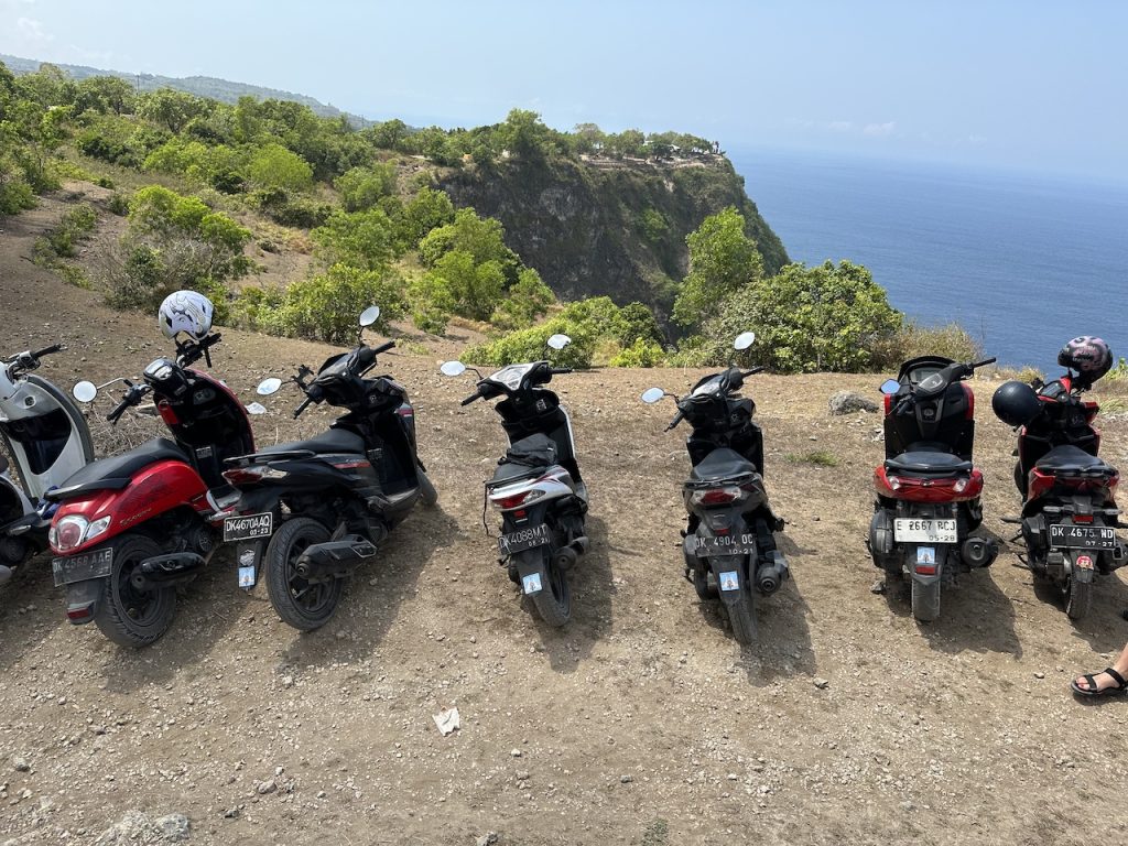 We hustled on down the road to the next stop, Kelingking beach. It wasn’t far down the road, but the ride provided plenty of potholes and crazy experiences for our memory banks. After we tied off our horses, we followed the crowd along another set of uneven steps carved out of stone. The mob passed by countless merchants selling hats, water, and souvenirs as we approached another eye-popping sight to behold.